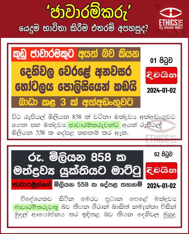 On January 02, 2024, the Divaina had reported two news stories related to drug dealers who were referred to using the derogatory terms “Jawaramun” (ජාවාරමුන්) and “Jawaramaku” (ජාවාරමකු). This usage violates media ethical guidelines. However, the appropriate word “Jawaramkaru” (ජාවාරම්කරු) was used in the news content.