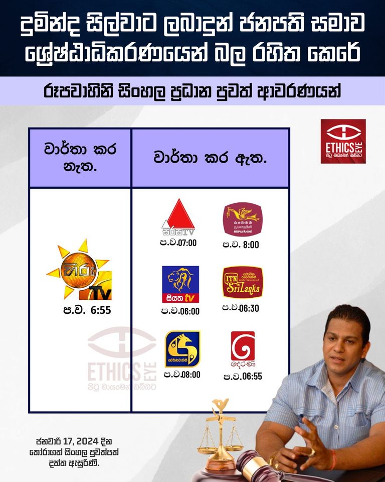 On January 17, 2024, the Supreme Court ordered the invalidation of the presidential pardon granted by former President Gotabaya Rajapaksa to former Parliamentarian Duminda Silva, who had been sentenced to death and imprisoned for the murder of Bharatha Lakshman Premachandra. Sirasa, TV Derana, Rupavahini, Swarnawahini, ITN, and Siyatha reported this story on the same day during their prime Sinhala news bulletins, whereas Hiru TV did not cover the story.