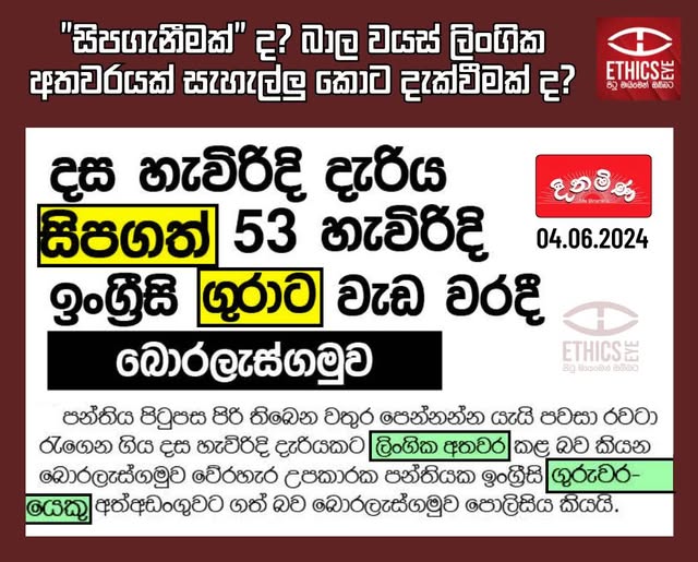 On June 04, 2024, Dinamina newspaper reported a case of sexual assault of a 10-year-old girl by a tuition teacher. The newspaper used a trivial headline containing the derogatory term “Gura” (ගුරා) and “Sipagath” (සිපගත්). However, in the content, Dinamina used more appropriate terms such as “Guruwarayek” (ගුරුවරයෙක්) and “Lingika Athawara” (ලිංගික අතවර) to describe the incident. Furthermore, mentioning the suspect's profession in the headline can promote marginalisation of the profession and is considered unethical. The media is advised to avoid using derogatory or trivial language that stirs up emotions and to adhere to ethical reporting standards.