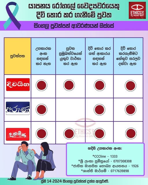On June 14, 2024, the Divaina, Aruna, and Dinamina newspapers reported the tragic death by suicide of a doctor at the Point Pedro Hospital in Jaffna. All three newspapers published the story without including any helplines and described both the reasons for and the method of the suicide, which constitutes a violation of media ethical guidelines. Additionally, Divaina and Dinamina gave the report undue prominence. Media is advised against such reporting, particularly when covering sensitive and negative content, as they can act as a catalyst for further suicides.
