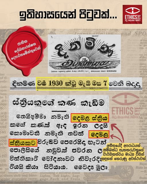 On May 07, 1930, the Dinamina newspaper reported an incident in which one woman assaulted and injured another. The article used the term “Demala sthriya” (දෙමළ ස්ත්‍රිය) to describe a woman, even though their ethnicity was irrelevant to the incident. Using such terms promotes ethnic stereotyping. Media is advised to avoid such language, especially in negative contexts, as it violates ethical reporting guidelines.