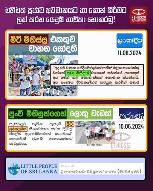 On June 11, 2024, the Lankadeepa newspaper, and on June 10, 2024, the Aruna newspaper, reported an incident in which members of the “Little People of Sri Lanka Association” conducted a vehicle washing program on the road in front of the Mount Lavinia Cemetery on June 8, 2024. The Lankadeepa headline used the derogatory term “Miti Minissu” (මිටි මිනිස්සු) in its headline, which may contribute to the marginalisation of people with dwarfism and is considered unethical. However, Aruna used the appropriate term “Punchi Minisun” (පුංචි මිනිසුන්) to refer to them. The media is advised to maintain neutrality in their reporting and avoid using language that negatively highlights disabilities or promotes marginalisation.