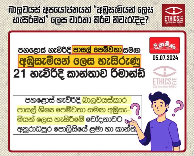 On July 05, 2024, the Dinamina newspaper reported a case of sexual assault involving a 15-year-old boy and an adult woman. The newspaper used a trivialised headline and included derogatory terms such as “Pasal pemwatha” (පාසල් පෙම්වතා) and “Ambu samiyan lesa hasirunu” (අඹුසැමියන් ලෙස හැසිරුණු) to describe the incident in the content too. Even if such abuse appears consensual, the victim is a minor, and the failure to clearly state that this is a punishable offense may lead society to perceive such acts as less serious. Therefore, the media is advised to avoid derogatory or trivialising language and adhere to ethical reporting standards.