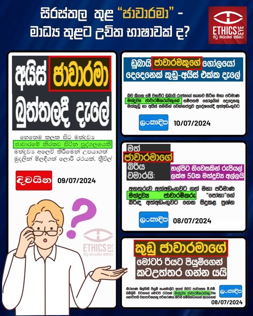 On July 08 and 10, 2024, Lankadeepa, and on July 09, 2024, Divaina, reported four news stories about drug dealers. The headlines used the derogatory term “Jawarama” (ජාවාරමා), which violates media ethical guidelines. However, within the content, the newspapers used the appropriate and ethical term “Jawaramkaru” (ජාවාරම්කරු).
