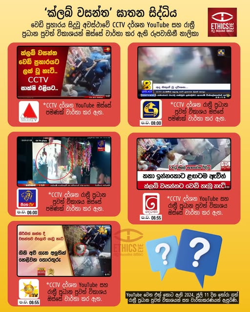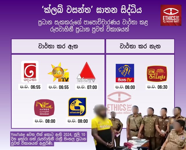 On July 10, 2024, TV Derana, Hiru TV, Sirasa, Rupavahini, and Swarnavahini reported on a statement given to the police by a suspect in the “Club Wasantha” murder case. Siyatha and ITN did not report the story. Although Siyatha received the video footage, it announced during its news bulletin that it would not broadcast it, citing media ethics; a commendable decision. TV Derana and Hiru TV aired the footage on YouTube and in their prime-time news bulletins, while Sirasa, Swarnavahini, and Siyatha published it only on YouTube. Siyatha, Hiru TV, and TV Derana also issued warnings about sensitive content. Broadcasting such CCTV footage, even when blurred, can shock viewers and violates media ethical guidelines.