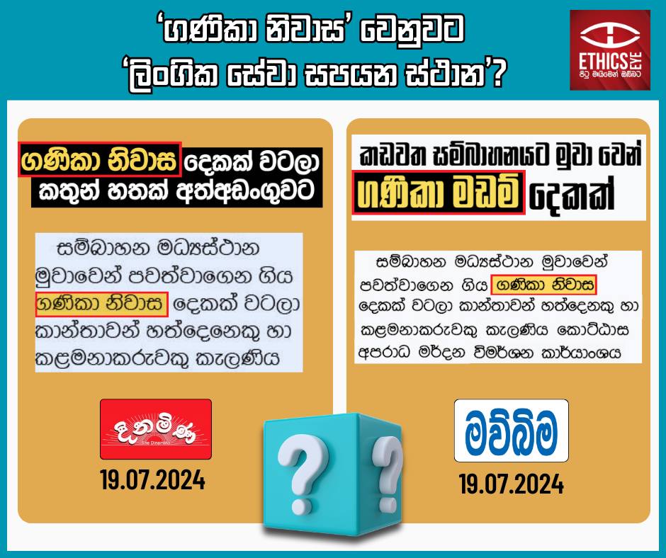 On July 19, 2024, the Dinamina and Mawbima newspapers reported on the raid of two sex service establishments. Both newspapers used derogatory terms such as “Ganika niwasa” (ගණිකා නිවාස) and “Ganika madam” (ගණිකා මඩම්), which contribute to the sexual objectification of women and promote marginalisation and negative attitudes. Media is advised to avoid such terms, especially in negative contexts, as their use is considered unethical.