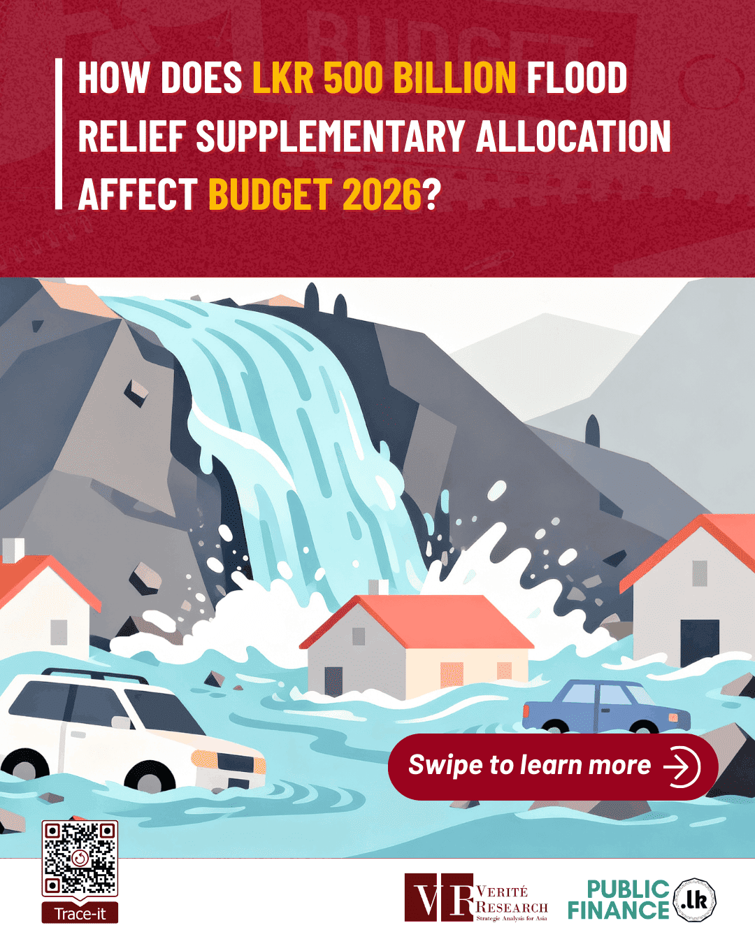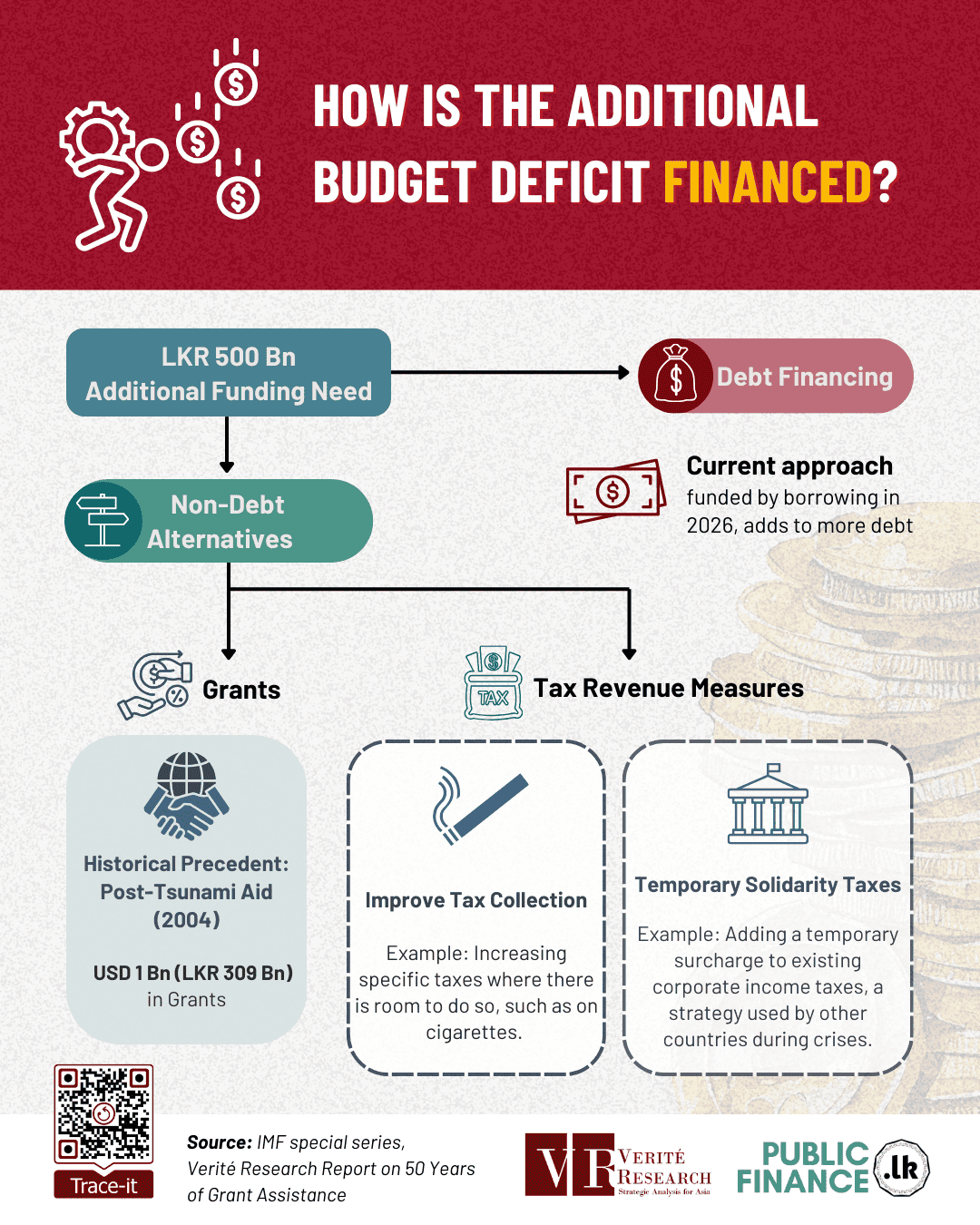 On 19 December 2025, the Sri Lankan Parliament approved a supplementary allocation of LKR 500 billion (approximately USD 1.6 billion) to fund recovery efforts following the devastation caused by Cyclone Ditwah. However, this additional spending also lifts the budget deficit expected for 2026 to 6.5% of GDP, squeezing fiscal space. This study sets out non-debt options such as grant mobilisation and targeted revenue measures.