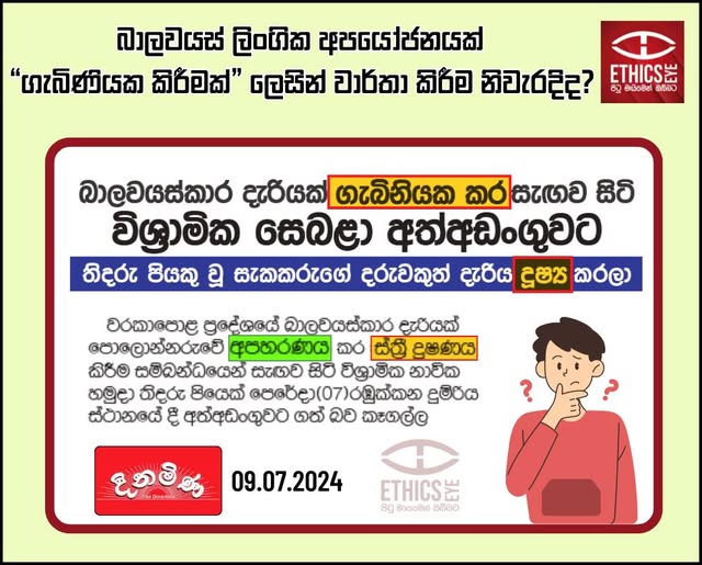 On July 09, 2024, the Dinamina newspaper reported an alleged case of abuse involving a minor girl and a retired army officer. The headline used the trivialising phrase “Gabiniyaka kara” (ගැබිනියක කර), and the content included the terms “Dushya” (දූෂ්ය) and “Sthri duushanaya” (ස්ත්රී දූෂණය), as well as the appropriate term “Apaharanaya” (අපහරණය). While legal texts use the term rape for sexual crimes, such language can suggest the term rape is used in legal texts to refer to sexual crimes, such terminology can imply that victims are defiled, thereby reinforcing stigma, discrimination, and social hostility toward those subjected to such crimes. Using such language is unethical, because it normalises the offence and downplays its seriousness. Media are advised to avoid derogatory or such trivialising language, especially in sensitive contexts, to maintain ethical reporting standards.