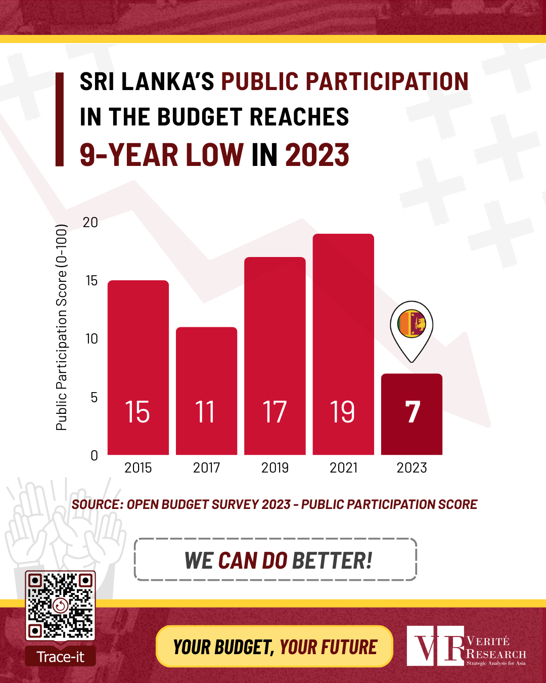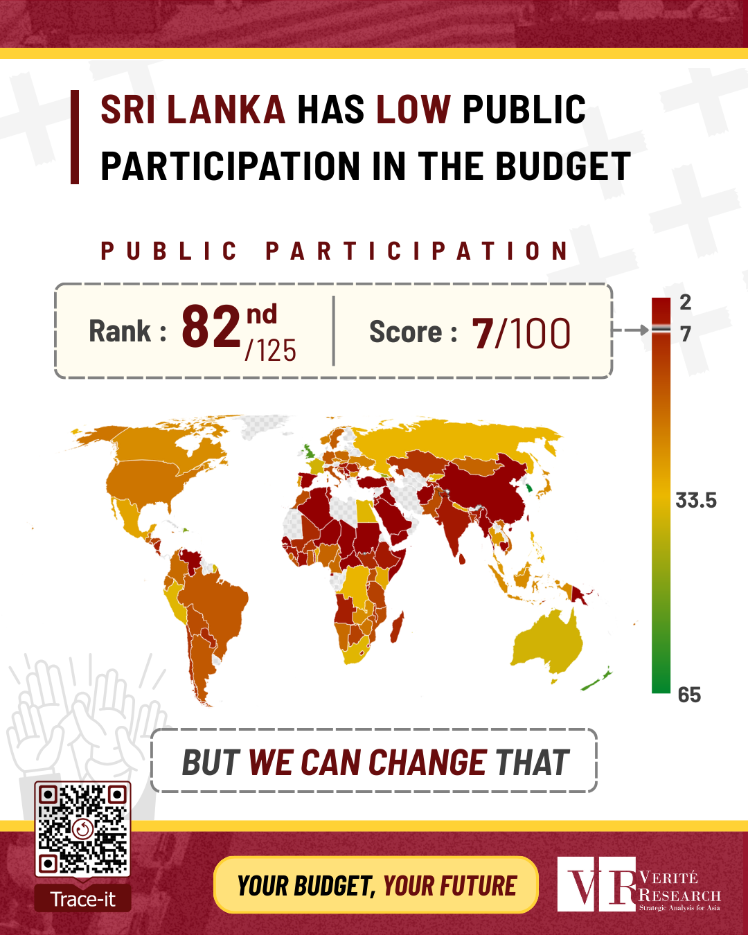 Sri Lanka has lacked effective and convenient channels for public participation in the budget process. In the Open Budget Survey 2023, Sri Lanka had the lowest participation score in a decade and ranked 82nd out of 125 countries.