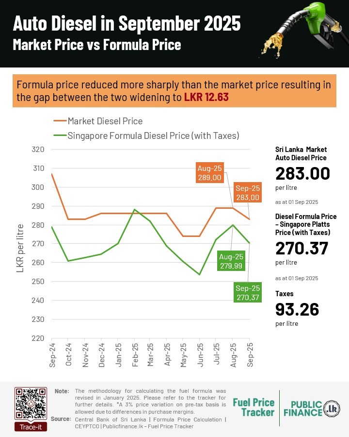 In contrast, the retail price of diesel continues to exceed its formula price. In September, the gap widened to LKR 12.63, up from LKR 9.01 in August, remaining above the allowable threshold. This breach has persisted since April 2025, though the gap had been narrowing since June. The increase in September marks a reversal of that trend.