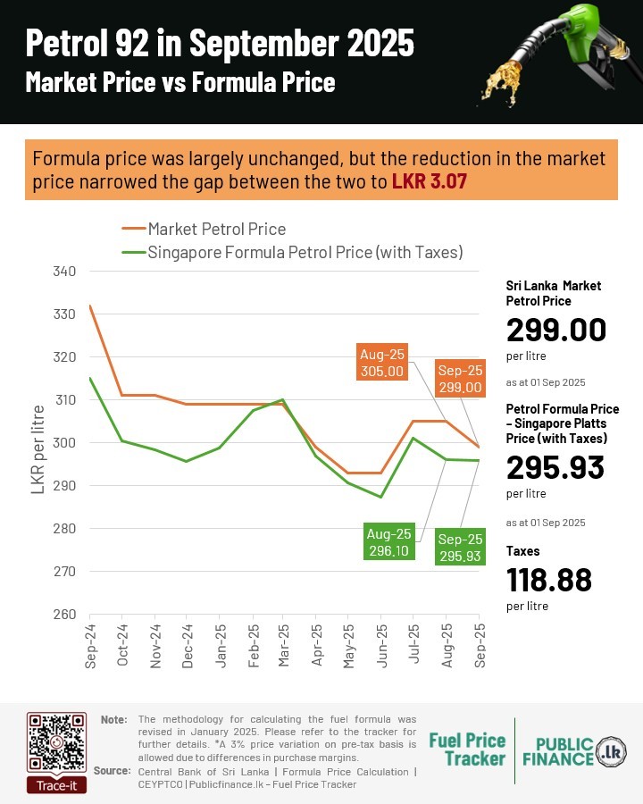 The reduction in the market price of petrol narrowed the deviation with its formula price to LKR 3.07, down from LKR 8.90 in August, bringing it within the allowable variation threshold* under the pricing formula.
