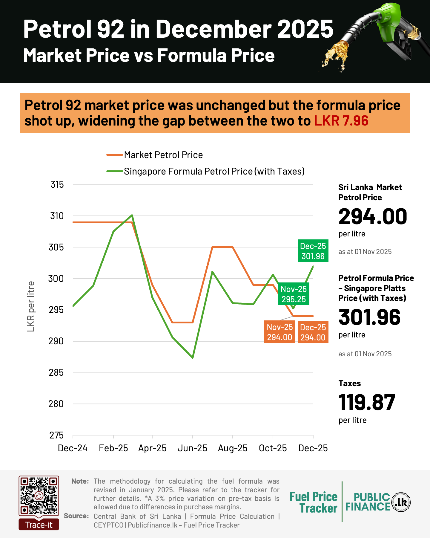 The market price of petrol 92 remained unchanged while the formula price shot up by LKR 6.71, widening the gap between the two to LKR 7.96.