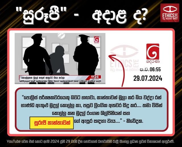 On 29 July 2024, Derana TV aired a news report about a man who posed as a police constable, deceived several women, robbed their jewellery and money, and then sexually assaulted them. The report referred to the women as "සුරූපී (Surupi)." References to physical appearance can contribute to the objectification and stereotyping of women. Media outlets are encouraged to present facts objectively and avoid sensational language.