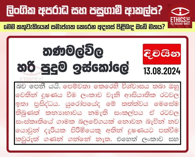 The Divaina editorial of 13 August 2024 aims to highlight the Thanamalwila sexual assault incident. However, instead of fulfilling this purpose, it appears to spread unfounded and prejudiced views on sexual abuse, while encouraging attitudes that further marginalize survivors.