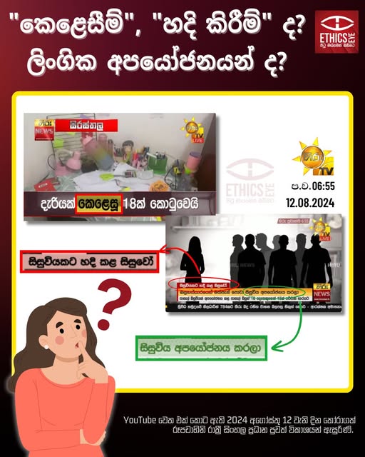 On 12 August 2024, Hiru TV used the terms "කෙළෙසූ" (kelesu) and “හදි කිරීම්“ (hadi kireem) in news subheadings when reporting the Thanamalwila student’s sexual assault case. The announcer, however, used the more appropriate term "ලිංගික අපයෝජනය" (lingika apayojanaya).
