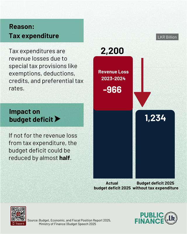 In the financial year 2023/24 the tax expenditure statement published by the government reported forgone reporting as LKR 966 billion in revenue. This tax expenditure figure amounts to around 3% of GDP and 21% of projected tax revenues in 2025. The fiscal implication of this is considerable, with the potential to reduce the budget deficit by nearly half—from LKR 2,200 billion to LKR 1,234 billion.