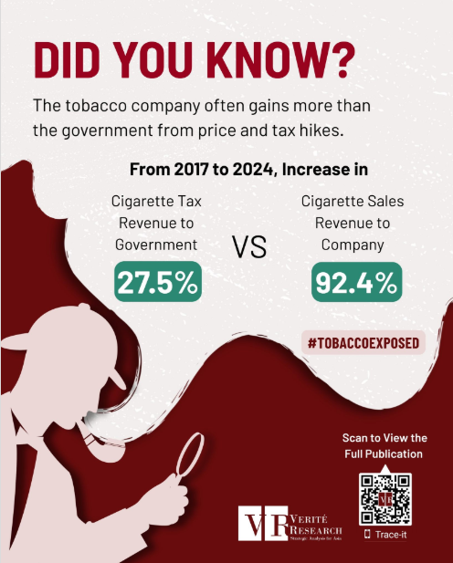 This infographic shows how tobacco companies often gain more than the government from cigarette price and tax increases. From 2017 to 2024, government revenue from cigarette taxes increased by 27.5%, while cigarette sales revenue earned by tobacco company increased by 92.4%.