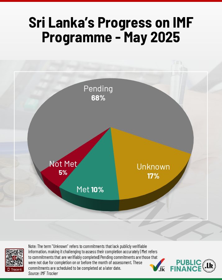 As of May 2025, 10% of Sri Lanka's IMF programme commitments were fully met 17% unknown (commitments that lack publicly verifiable information) 5% not met, and 68% remain pending (commitments that were not due for completion on or before the month of assessment).