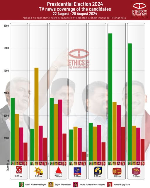 This infographic presents the airtime allocated to 2024 presidential candidates Ranil Wickremesinghe, Sajith Premadasa, Anura Kumara Disaanayaka, and Namal Rajapaksa on prime time Sinhala news broadcasts. Data was collected from TV Derana, Hiru, Sirasa, Siyatha, Swarnavahini, ITN, and Rupavahini between 22 August and 28 August 2024.