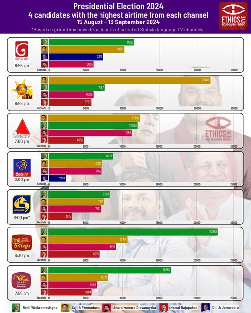 This infographic presents the airtime allocated to 2024 presidential candidates Ranil Wickremesinghe, Anura Kumara Disaanayaka, Sajith Premadasa, Namal Rajapaksa and Dilith Jayaweera on prime time Sinhala news broadcasts. Data was collected from TV Derana, Hiru, Sirasa, Siyatha, Swarnavahini, ITN, and Rupavahini between 15 August and 13 September 2024.