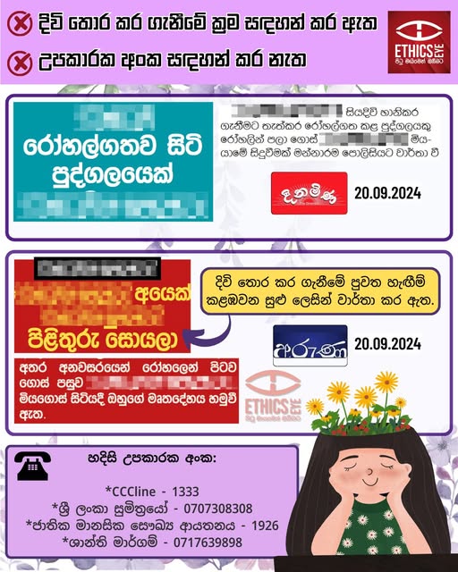 On 20 September 2024, Aruna and Dinamina newspapers reported on an individual who attempted suicide, was hospitalised, and later died by suicide. Both newspapers included specific details of the attempt and the method used in their headlines. Neither report provided emergency helpline numbers. Aruna also used a sensational headline and implied suicide as a solution to a problem.